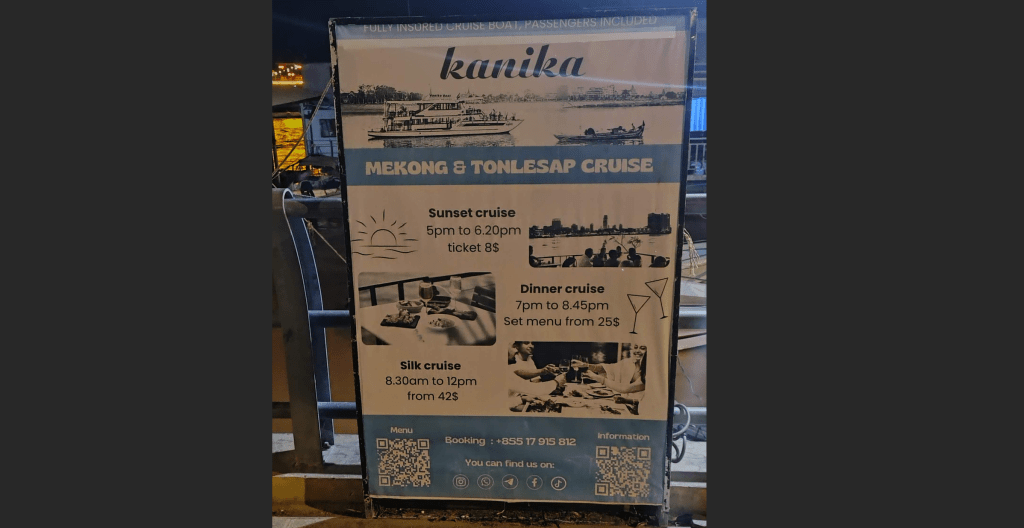 One of the highly recommended cruise options, I discovered it while strolling on Sisowath Quay. Substantially cheaper prices if you book sunset cruise or dinner and yet has great reviews on google. I personally did not go for the cruise, however for an illustration, they charge 8$ for sunset cruise with dinner. The same was 15$ at Onederz, probably by a different company.